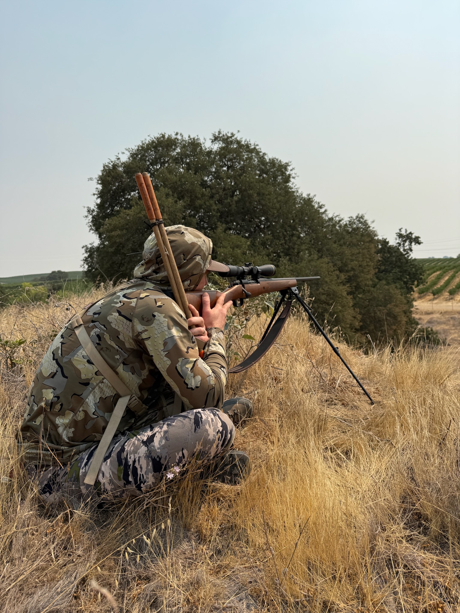To get a closer shot, we crawled to the top of the hill. Prone was not an option due to high grass, but I could use my Harris-style bipod to sit for a stable shot. To anchor the stock, I held Newkirk’s shooting sticks in my left hand and rested the foot of the stock on my left forearm. It was a solid rest.