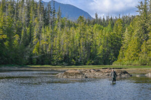 Guide Ted Chappell gets a closer look at a potential bear sighting on the shoreline of the estuaries that lead into the Pacific Ocean.